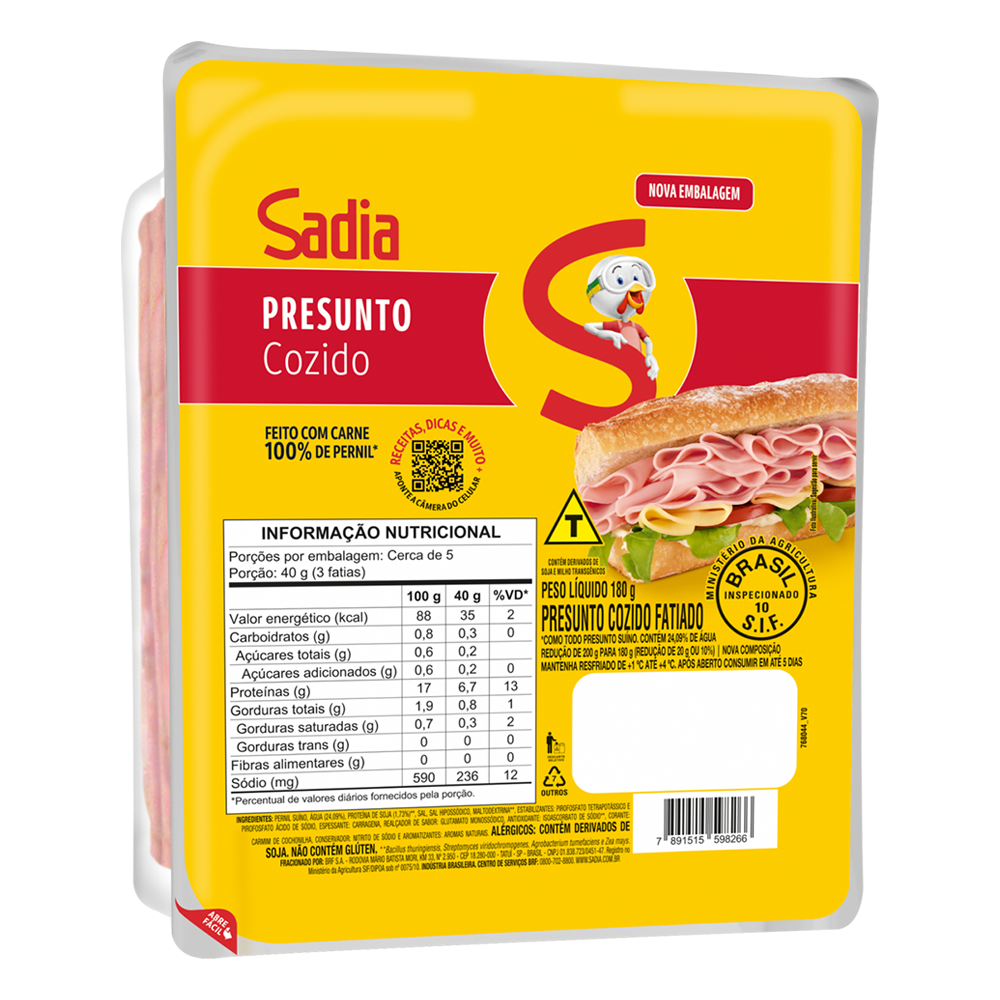 Presunto Cozido Fatiado - Sadia 180gr